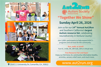 We are excited to welcome you back to an in-person Aut2Run at California State University Channel Islands on Sunday, April 26th, 2026! For those of you who can't experience Aut2Run in-person, but would still like to support Autism Society Ventura County, we will be offering a virtual option for you to participate in. This year is extra special to us as we celebrate Aut2Run's 14th anniversary!